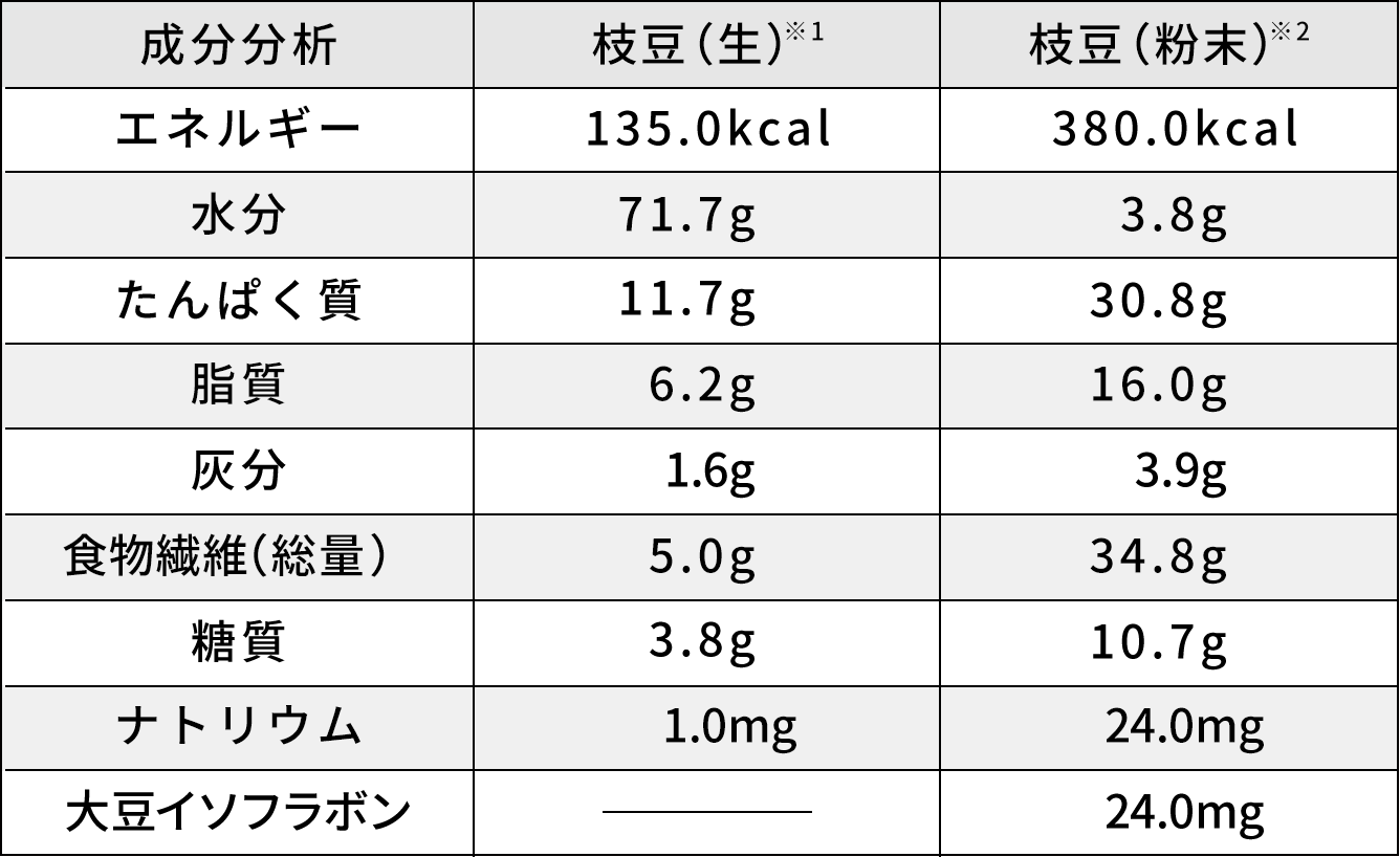 豊富な栄養素を含んだ秋田県産の枝豆を鞘ごと乾燥、粉末化した製品です。従来の枝豆と比較し、栄養成分が5倍ほどに濃縮。枝豆は、豆と野菜の両方の栄養特徴を持った緑黄色野菜です。枝豆には豊富な栄養素だけでなく、ポリフェノールに代表される数種類の機能性成分が含有されています。
