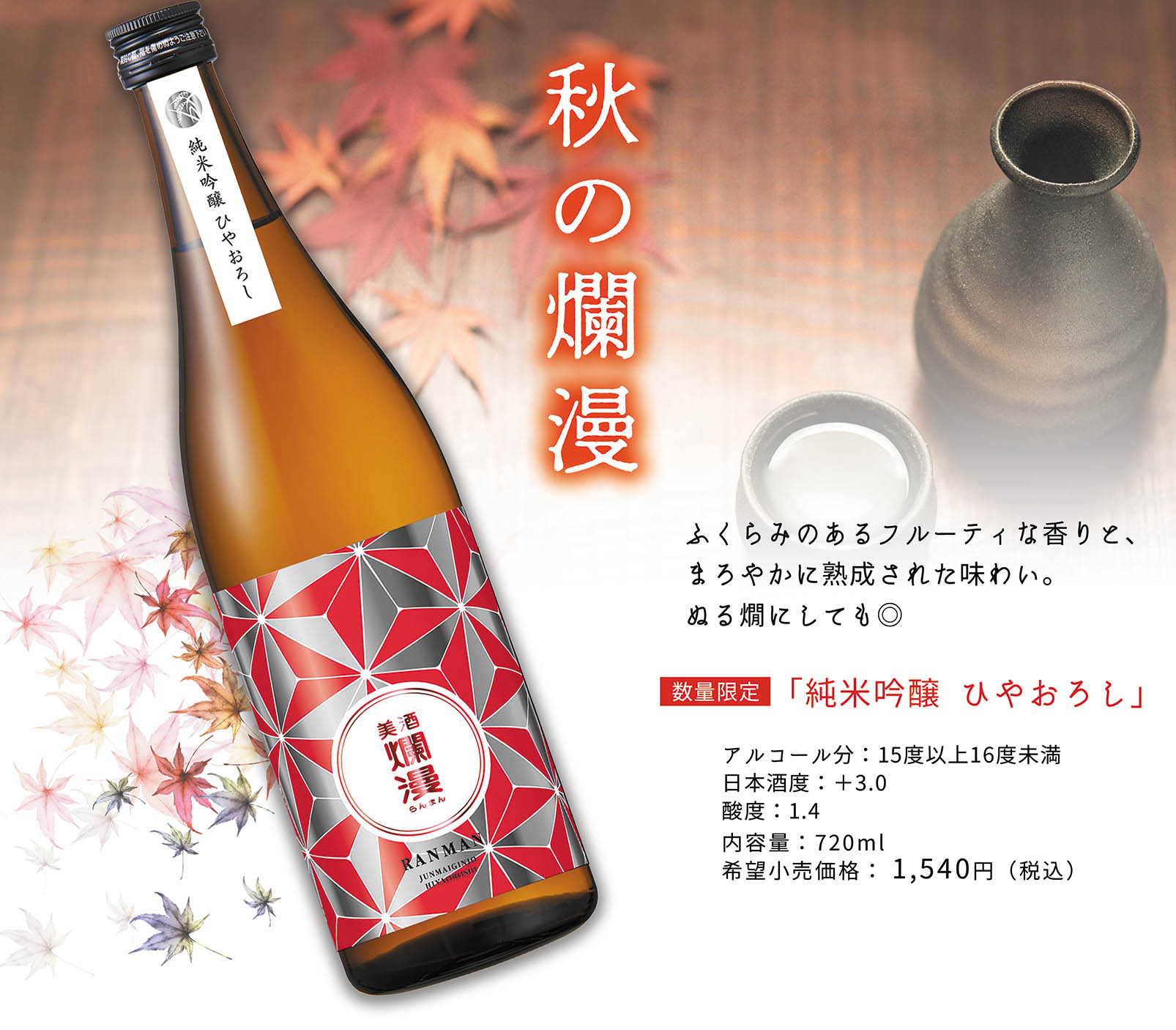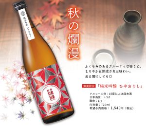 秋の爛漫「純米吟醸ひやおろし」を発売しました。 雪深く寒さ厳しい秋田の冬に仕込み、新酒のフレッシュさそのままに瓶詰め、ひと夏かけてゆっくりと低温で貯蔵し熟成させました。 ふくらみのあるフルーティな香りと、まろやかな味わいが、口いっぱいに広がります。 美味しい季節の料理と「純米吟醸ひやおろし」で「旬」の味わいをお楽しみください。
