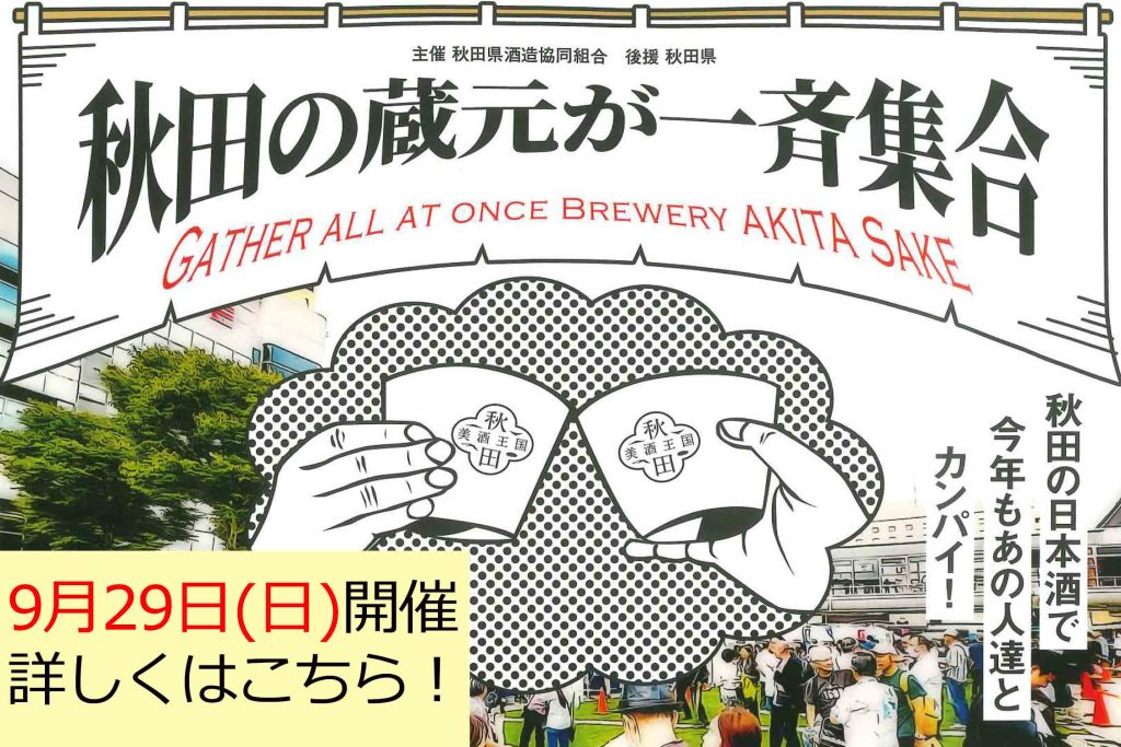 秋田の蔵元が一斉集合!「秋田の酒を楽しむ会」が2024年9月29日(日)に開催! 10月1日の『日本酒の日』に先駆けて、秋田の酒を楽しむ会を開催します。今年は会場を秋田駅アゴラ広場に設定。 美味しい秋田の日本酒を楽しみましょう!